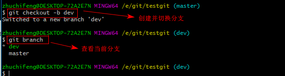 首先,我们来创建dev分支,然后切换到dev分支上。如下操作: