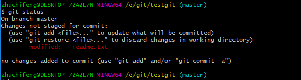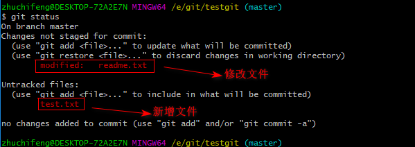 我们在readme.txt再添加一行内容为4444444,接着在目录下新建一个文件为test.txt 内容为test,我们先用命令 git status来查看下状态,如下: