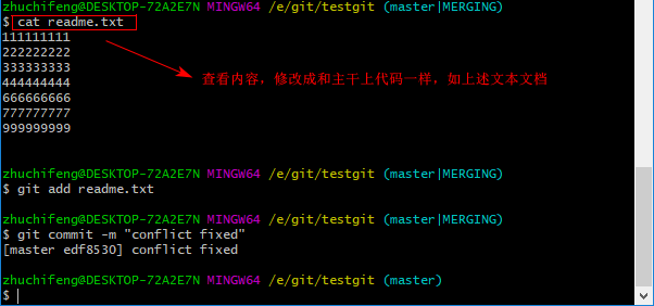 同样,我们现在切换到master分支上来,也在最后一行添加内容,内容为99999999,如下所示: