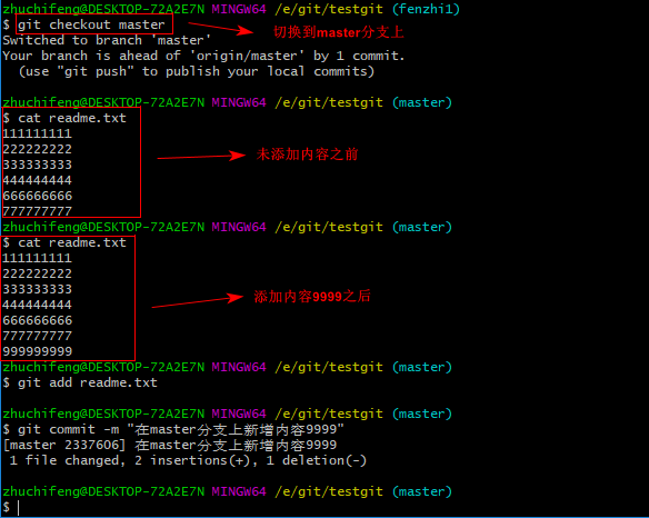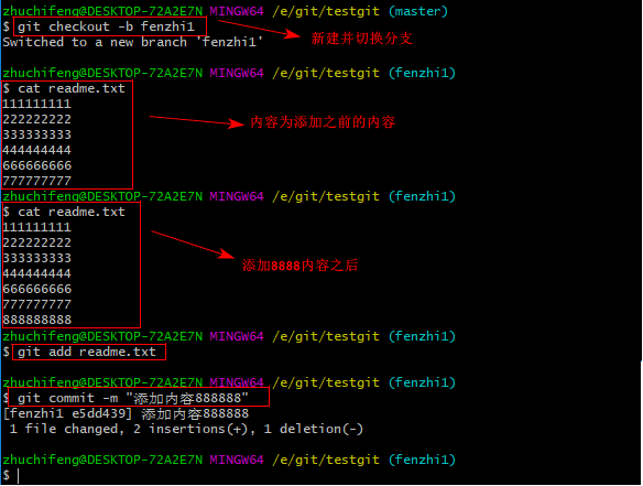 下面我们还是一步一步来,先新建一个新分支,比如名字叫fenzhi1,在readme.txt添加一行内容8888888,然后提交,如下所示: