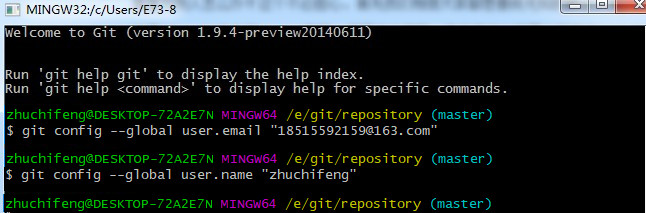 注意:git config --global 参数,有了这个参数,表示你这台机器上所有的Git仓库都会使用这个配置,当然你也可以对某个仓库指定的不同的用户名和邮箱。