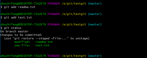 现在我们先使用git add 命令把2个文件都添加到暂存区中,再使用git status来查看下状态,如下: