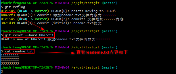 通过上面的显示我们可以知道,增加内容3333的版本号是 b8a7cf3.我们现在可以使用命令
