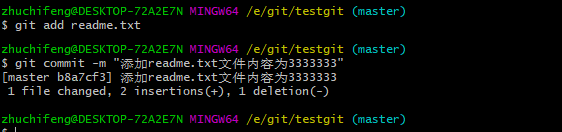 假如我现在版本库testgit目录添加一个文件b.txt,然后提交。如下: