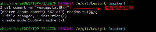 知道了对readme.txt文件做了什么修改后,我们可以放心的提交到仓库了,提交修改和提交文件是一样的2步(第一步是git add 第二步是:git commit)。如下: