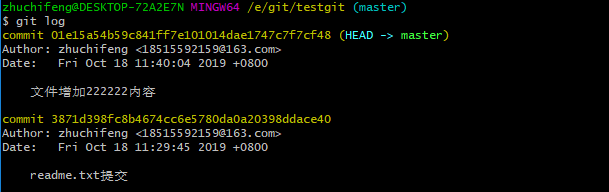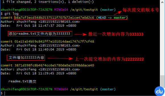 现在我已经对readme.txt文件做了三次修改了,那么我现在想查看下历史记录,如何查呢?我们现在可以使用命令 git log 演示如下所示: