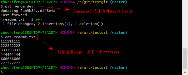 git merge命令用于合并指定分支到当前分支上,合并后,再查看readme.txt内容,可以看到,和dev分支最新提交的是完全一样的。