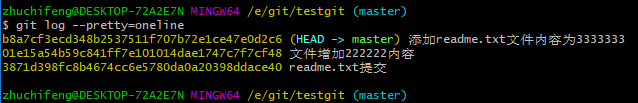 git log命令显示从最近到最远的显示日志,我们可以看到最近三次提交,最近的一次是,增加内容为333333.上一次是添加内容222222,第一次默认是 111111.如果嫌上面显示的信息太多的话,我们可以使用命令 git log --pretty=oneline 演示如下: