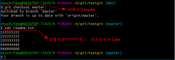 现在dev分支工作已完成,现在我们切换到主分支master上,继续查看readme.txt内容如下: