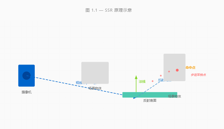 原理: SSR 基于当前帧的深度和颜色缓冲区,通过光线步进检测反射命中点
