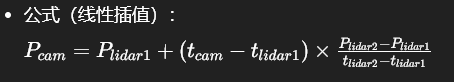 3.帧匹配,雷达10hz,相机30hz 以相机时间戳为基准,取前后两帧雷达点云插值到相机的曝光时刻