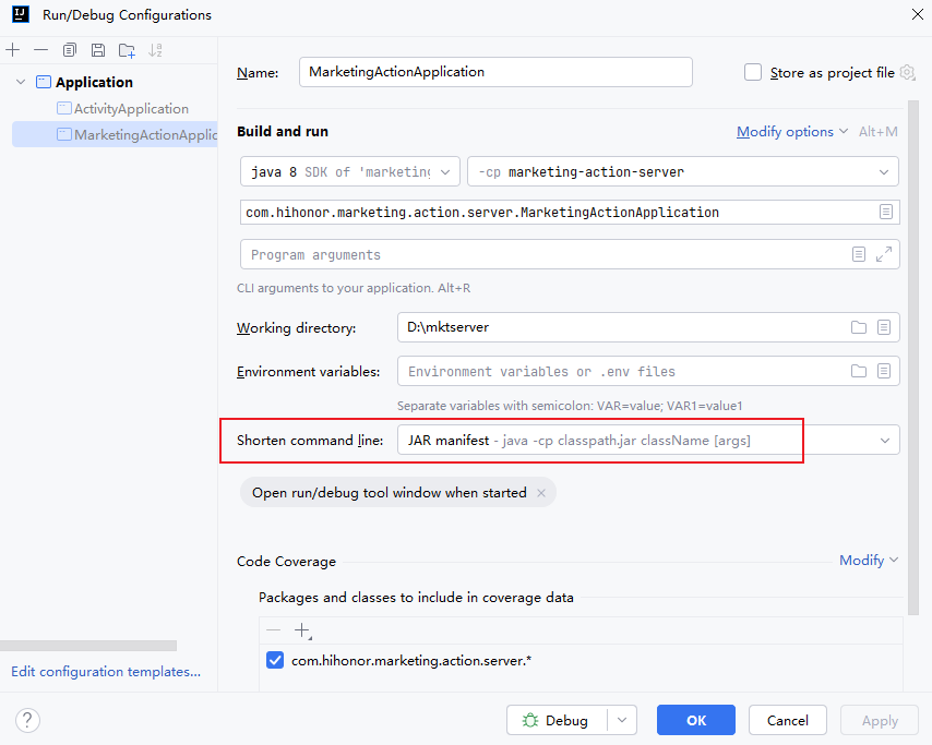 在 IntelliJ IDEA 的 Run/Debug Configurations 中,Shorten command line 选项用于控制在启动应用程序时如何传递命令行参数给 JVM。