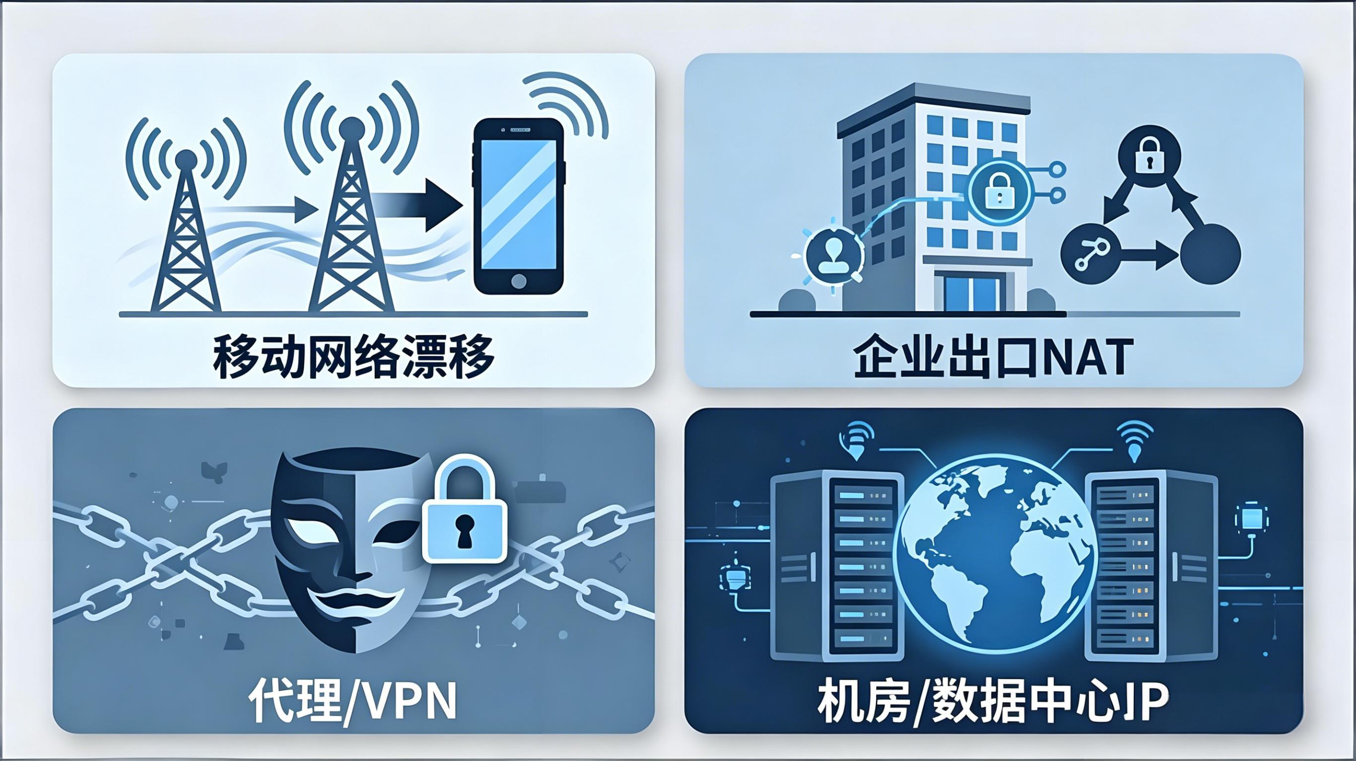 | 企业出口 NAT | 归属地代表出口而非个人 | 结合设备 ID 等信息综合判断 |