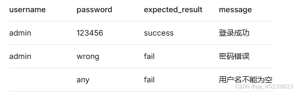 { "username": "admin", "password": "123456", "expected": "success", "message": "登录成功" }, { "username": "admin", "password": "wrong", "expected": "fail", "message": "密码错误" }