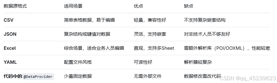 TestNG的@DataProvider配合外部文件(Excel/JSON/CSV)灵活强大。