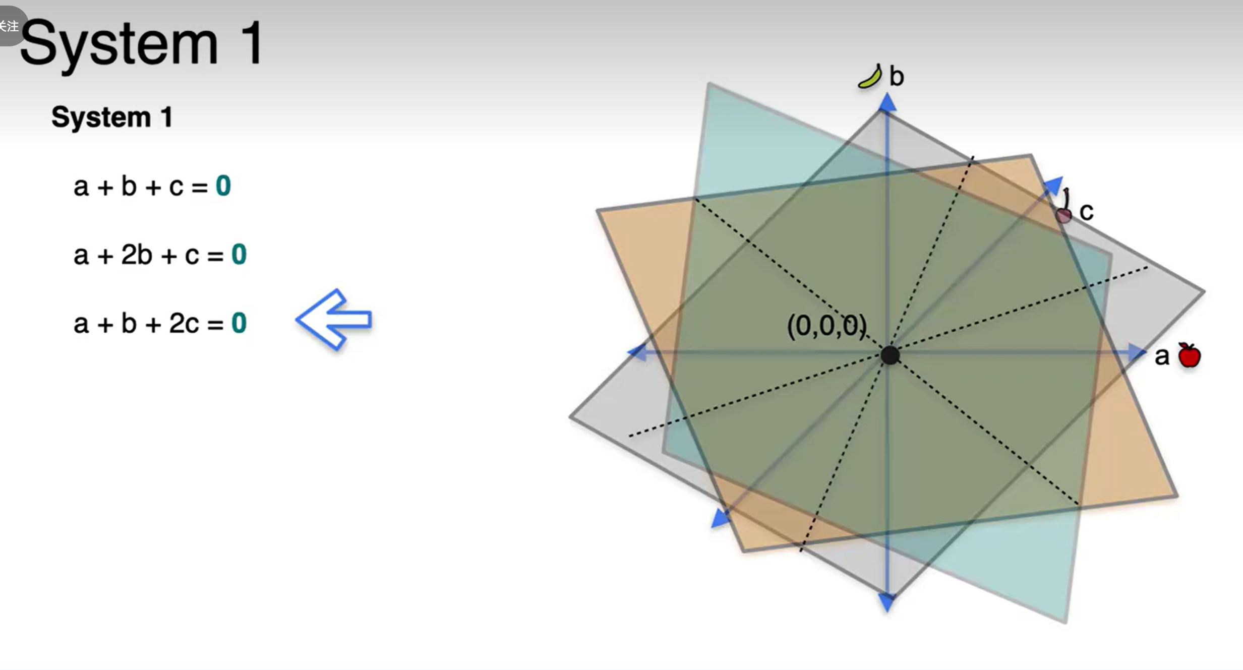 the 3 planes intersect at a single point, which is precisely the (0,0,0)