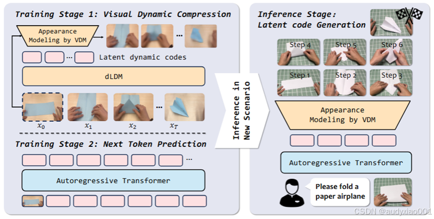 本部分将介绍VideoWorld 2的架构设计。VideoWorld 2整体架构被分为了训练阶段和推理阶段,如图1所示。