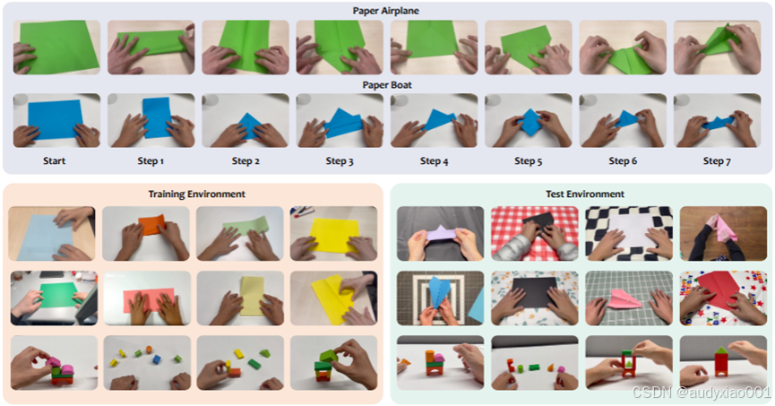 论文中引入了Video-CraftBench,这是一个第一人称视频教程数据集,涵盖五个长时程手工任务:折纸飞机、折纸船,以及用积木搭建塔/马/人。这些手工任务具有难以用语言描述的细粒度、视觉多样化的操作。研究团队通过手动录制和互联网资源收集了约7小时(分为约9.5k个片段)的教程视频,用于长时程知识评估。折纸任务通常持续40-80秒,积木搭建任务持续20-30秒。该基准分为训练集和测试集。测试集(约150个单独收集的视频)包含训练中未见过的新背景、纸张纹理和积木排列,以评估知识的可迁移性。
