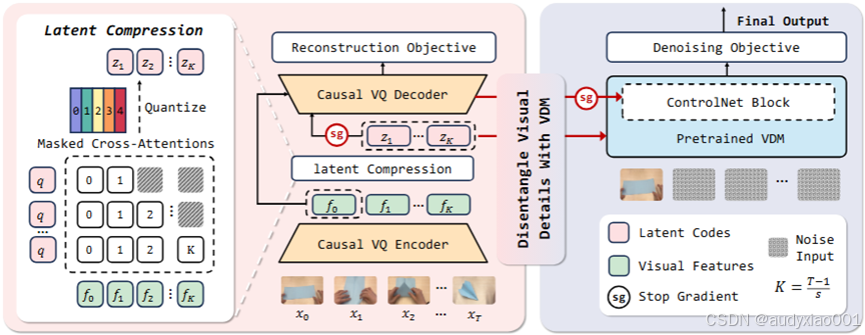 直接训练VDM从噪声生成未来帧会非常缓慢,并且容易产生错误的运动,因为它从未在长时程手工制作等目标任务上进行过训练。因此复用VQ-VAE解码器将隐式编码重建为低保真但富含运动的输出,提供手部运动和物体位移等粗略的时间线索。该信号通过一个梯度停止的、类似ControlNet的分支输入到VDM中。这稳定了训练,并允许VDM专注于细化外观而非从头推断运动。此外,解码器到隐式编码的梯度流被停止,以防止引入无关噪声。