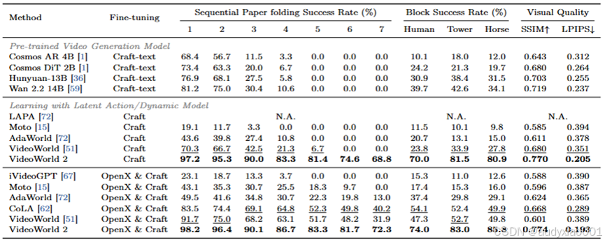 相比之下,VideoWorld 2(第9行)在测试环境中生成了完整且连贯的任务序列。值得注意的是,无需对这些隐式编码进行大规模预训练,仅在Video-CraftBench上训练就实现了68.8%的折纸任务成功率和高达81.5%的积木堆叠任务成功率。此外,得益于VDM的外观先验,VideoWorld 2不仅生成了准确的动作,还生成了具有更高SSIM和PSNR指标的视频。