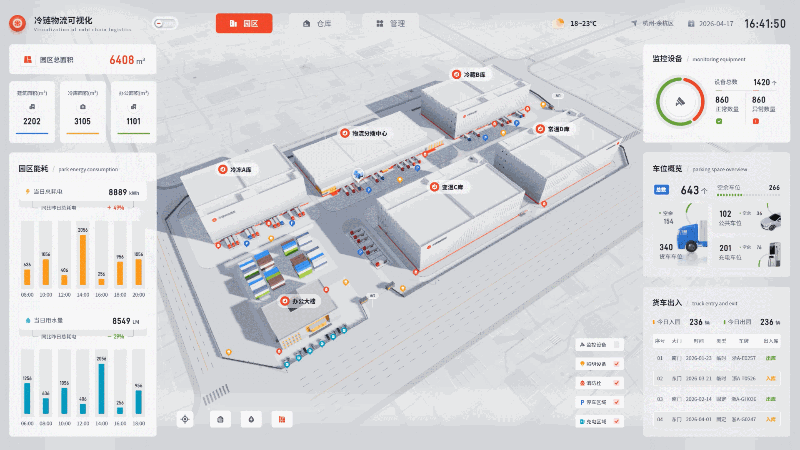 在冷链物流场景中,温控与能耗管理直接关系到货物品质和运营成本,传统管理方式已难以满足精细化运营 需求。本项目基于园区实景构建简约风三维场景,实现冷链物流系统的可视化管理,帮助管理者直观掌握温控和能耗情况,推动冷链物流智能化升级。