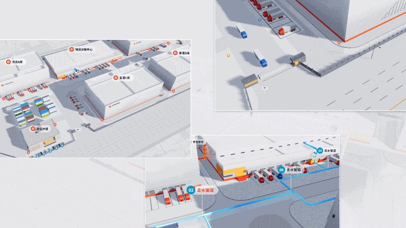 画面中叠加关键业务数据 ,通过可视化看板实时展示园区运行状态,同时在冷库区域、分拣中心及办公区域等设置标记点 ,实现重要位置的快速定位与信息查看。