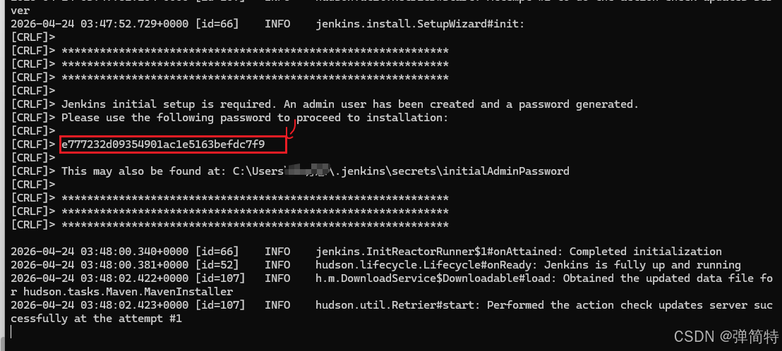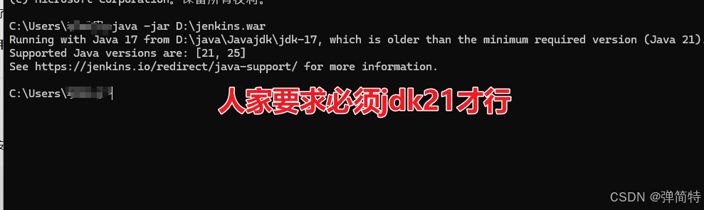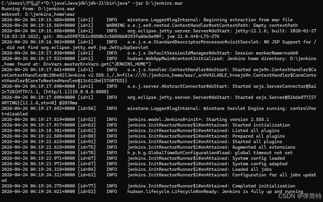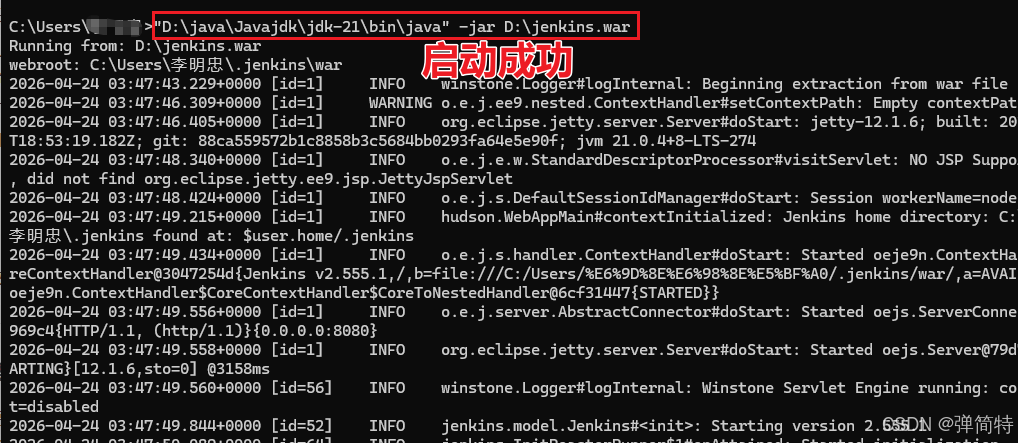 然后输入这个命令"D:\java\Javajdk\jdk-21\bin\java" -Dhudson.model.DirectoryBrowserSupport.CSP= -jar D:\jenkins.war