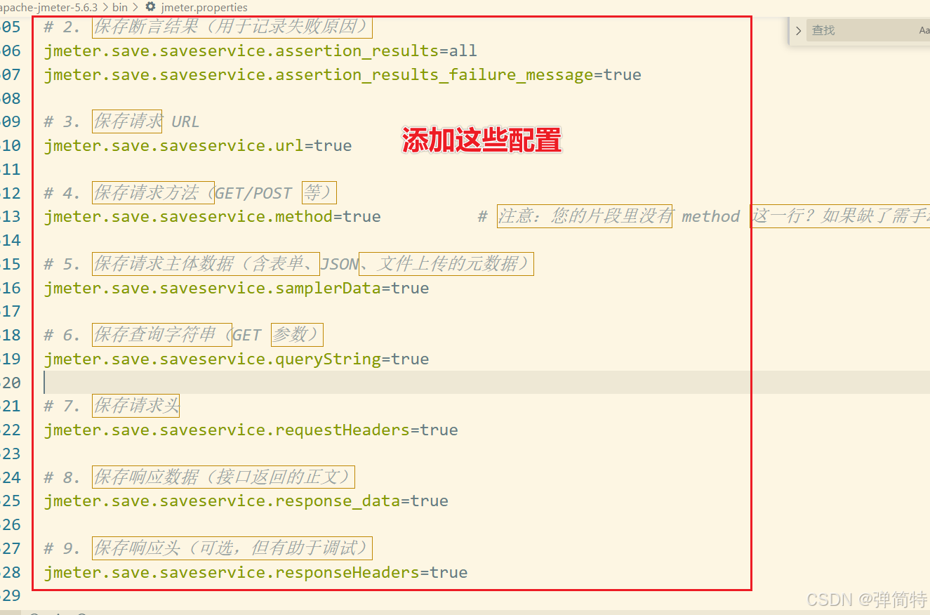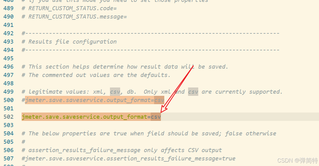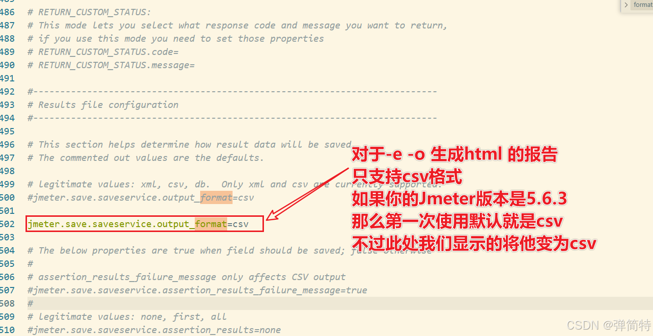 -e -o通常要和-n -t(运行测试)或者-g(已有 jtl 文件)配合使用。-e -o只支持csv格式,即jmeter.save.saveservice.output_format=csv(所以需要修改:bin/jmeter.propties文件,我们后面会讲怎么修改)