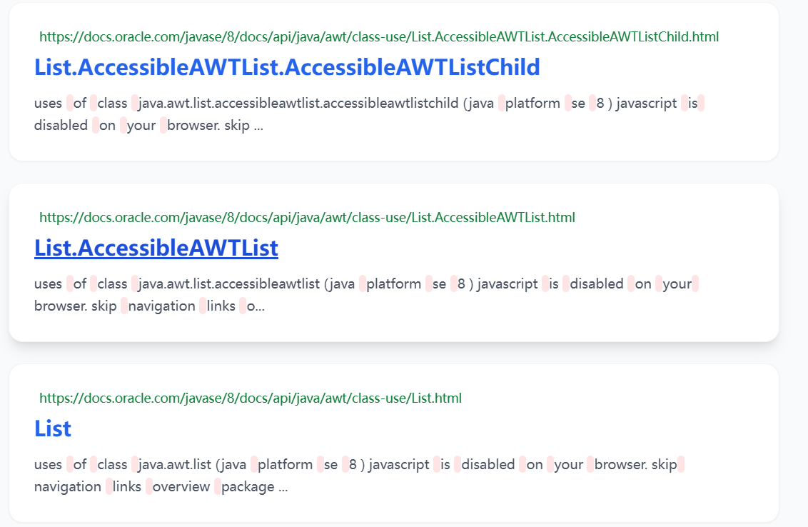 如果我们输入的 query 为"Array List",我们会发现查询的摘要里面空格也被算进了分词结果集中来执行倒排索引查询。有些无意义高频词,如 is、the、a、have 进行剔除,可以提升搜索速度与结果精准度。因此我们需要在网上找到现有的停用词表,再通过程序把停用词表加载到内存中。我们可以使用哈希表来存储这些停用词,再针对分词结果在哈希表中进行筛选。
