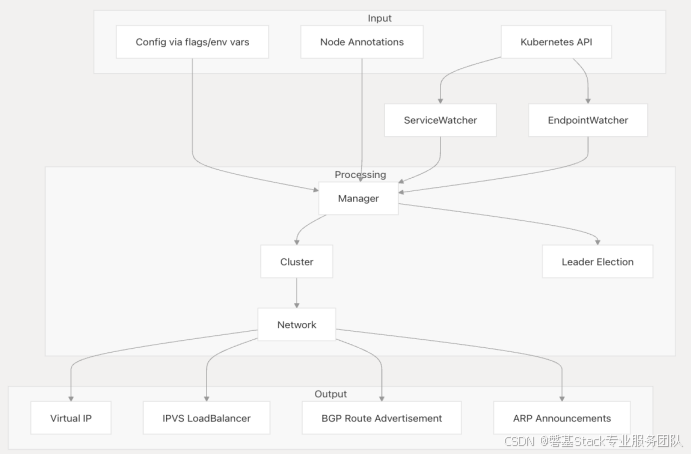- Manager:核心控制器,接收所有输入,处理VIP配置、服务事件和LeaderElection