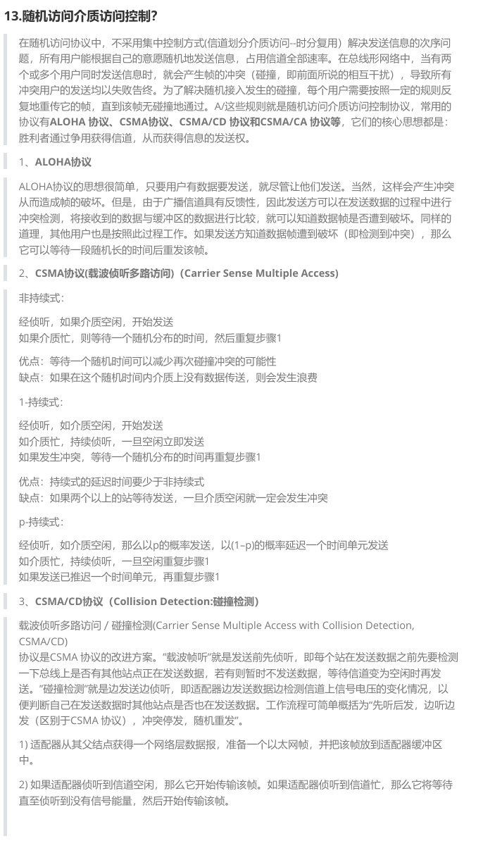 CSMA/CD 是带冲突检测的载波监听多路访问,典型用于传统总线型以太网。它的原则可以概括为:先听后发,边发边听,冲突停止,随机重发。