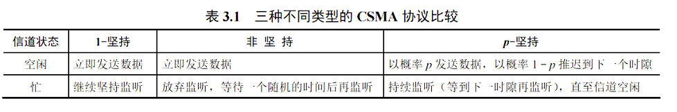 CSMA 的常见策略包括 1-坚持 CSMA、非坚持 CSMA 和 p-坚持 CSMA。