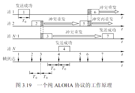 纯 ALOHA 的思想非常简单:站点有数据就立即发送。如果发送后发现冲突或没有收到确认,就等待一个随机时间后重发。