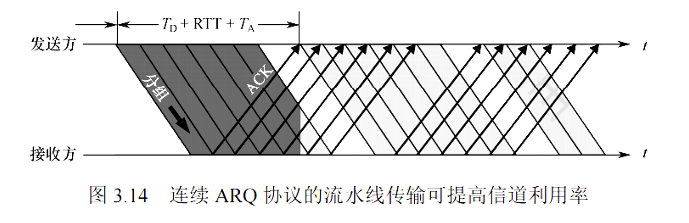 如果确认帧很短,(T_A) 常可忽略。这个公式体现了为什么传播时延越大、帧越短,停止-等待协议效率越低。