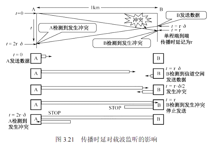 CSMA 相比 ALOHA 能减少冲突,但不能完全避免冲突。原因是信号传播存在时延:一个站点监听到信道空闲时,可能另一个远端站点的信号还没有传播到它这里,于是两个站点仍可能同时发送。