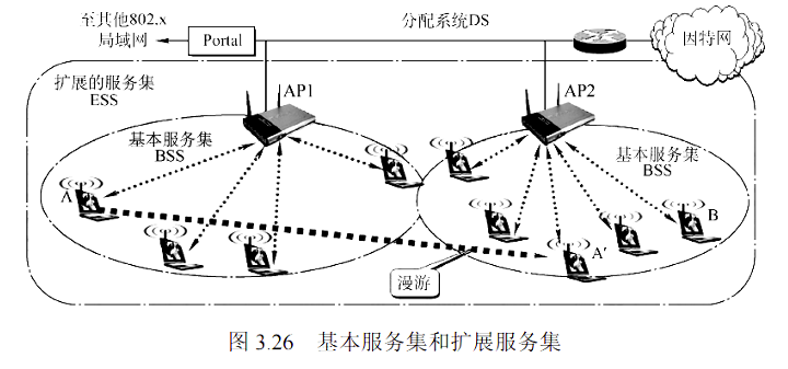 无线局域网的基本组成包括无线站点、接入点 AP 和基本服务集 BSS。一个 AP 及其覆盖范围内的无线站点构成一个基本服务集。多个 BSS 可以通过分布式系统连接,形成扩展服务集 ESS。