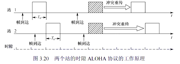 时隙 ALOHA 把时间划分为等长时隙,站点只能在时隙开始时发送。这样冲突只会发生在同一时隙内,减少了冲突可能性,最大信道利用率约为 36.8%。时隙 ALOHA 的效率高于纯 ALOHA,但需要全网时钟同步。