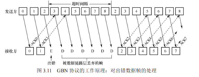 GBN 的特点是发送方窗口较大,接收方窗口为 1。它比停止-等待协议效率高,但如果链路误码率较高,一旦某帧出错,后续帧即使已经正确到达也会被丢弃,重传开销较大。
