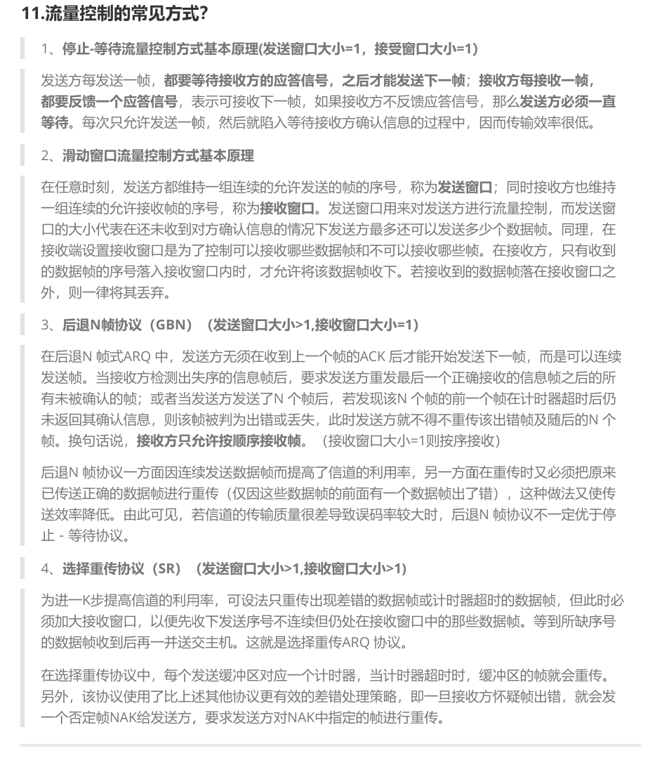 第二,流量控制和差错控制不是一回事。流量控制解决发送太快导致接收方来不及处理的问题;差错控制解决帧丢失、出错和重复的问题。很多协议把二者结合实现,但概念上要分开。