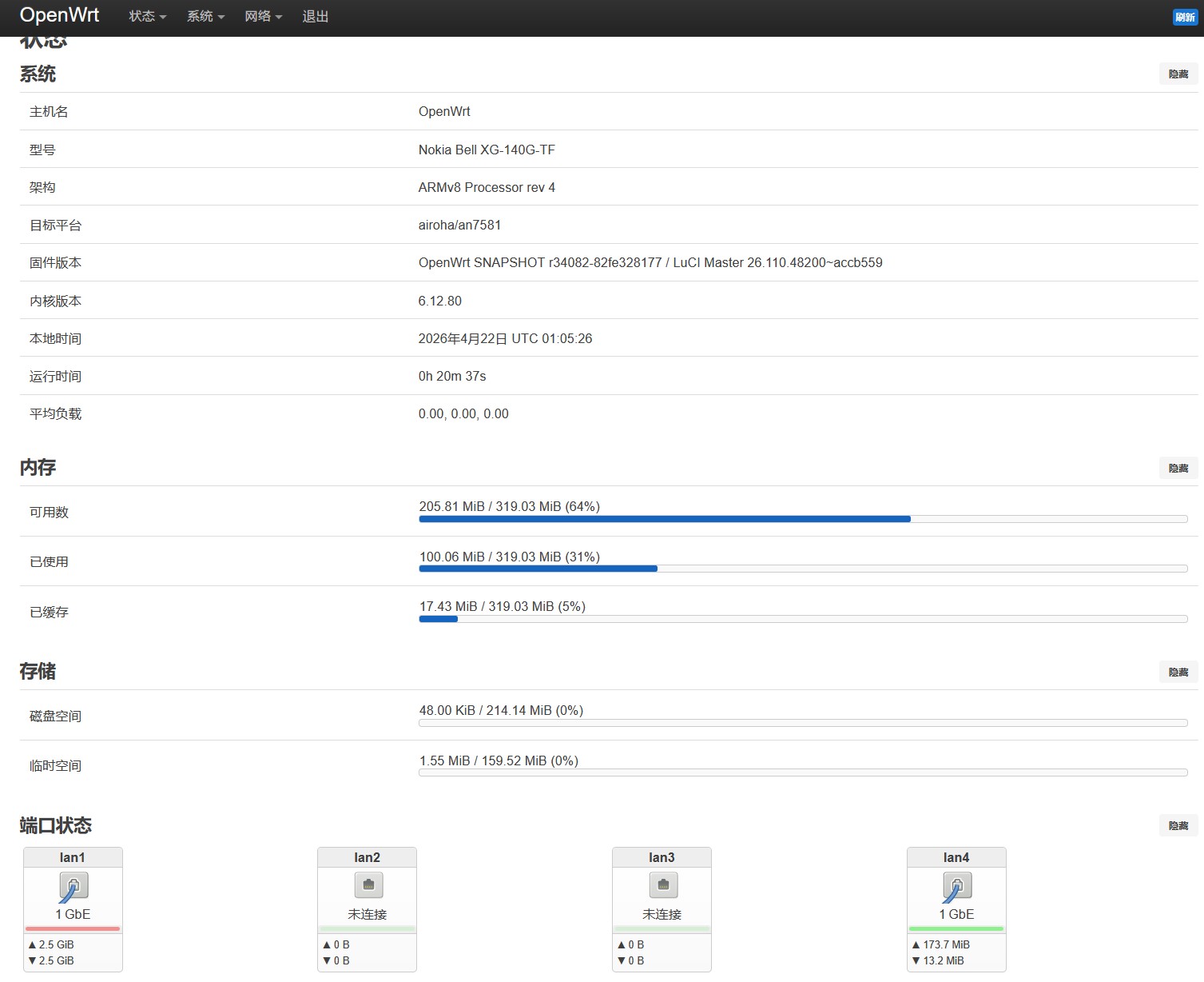 本固件基于 OpenWrt 6.12 内核,针对 Nokia XG-140G-TF 进行 2.5G PHY 修复 与 NPU 硬件 NAT 加速优化,可实现千兆满速下极低的 CPU 占用转发,系统结构保持极致精简。