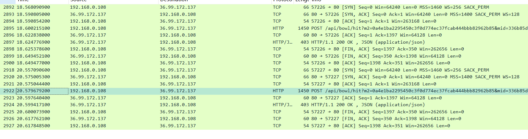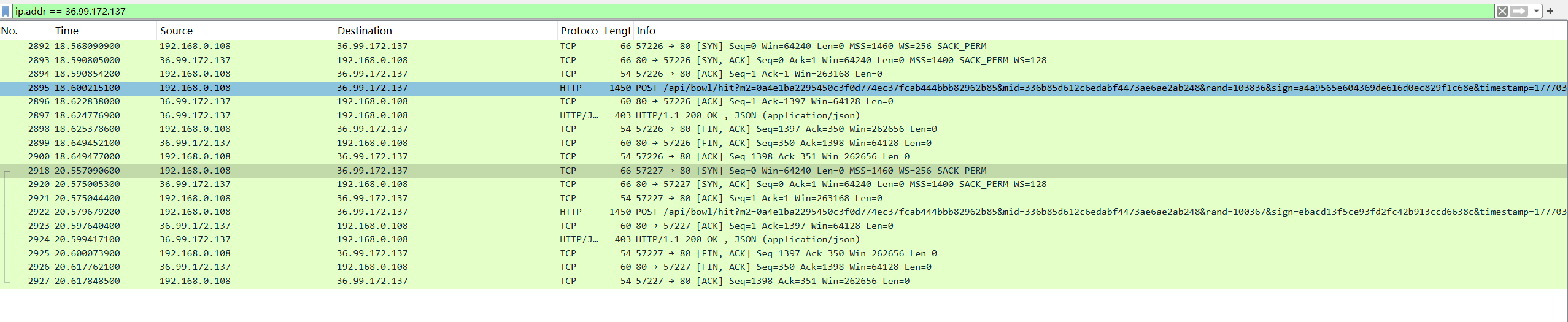 192.168.0.108 → 36.99.172.137,POST /api/bowl/hit?...,Len=1450(携带请求数据)- 服务器确认收到请求 :