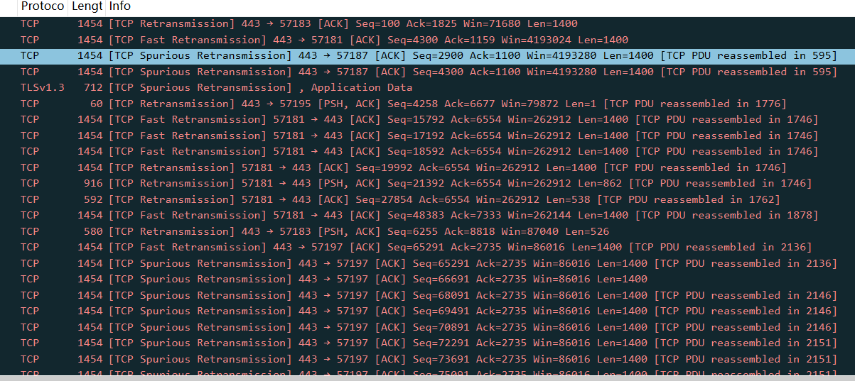 💡 补充:你之前的抓包里也出现了大量的虚假重传和超时重传,结合这次的乱序和 RST 重置,说明你的网络不是偶尔波动,而是持续存在丢包和延迟问题,这会直接影响 TCP 的所有可靠性机制,导致传输效率大幅下降。