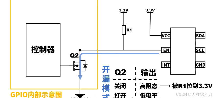 线与逻辑:多个开漏输出引脚直接相连,当所有引脚都输出高阻(高电平未上拉)时,总线为高;任何一个输出低电平,总线即被拉低。常用于I2C总线。