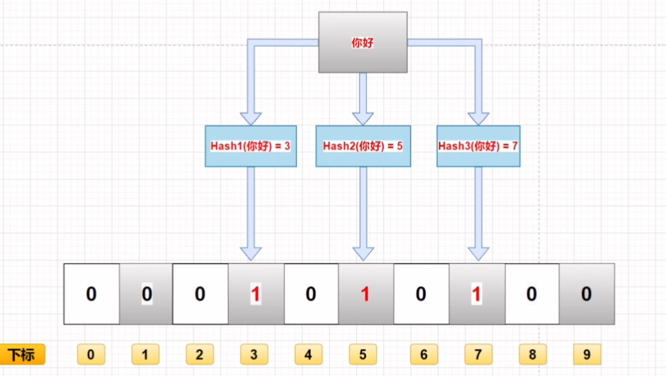 如图,假设我们计算出最优比特数组长度为3,则一个元素"你好"的哈希值就分为了三个,Hash1、Hash2、Hash3,值分别为3 5 7,并映射到数组中的对应的位置上。