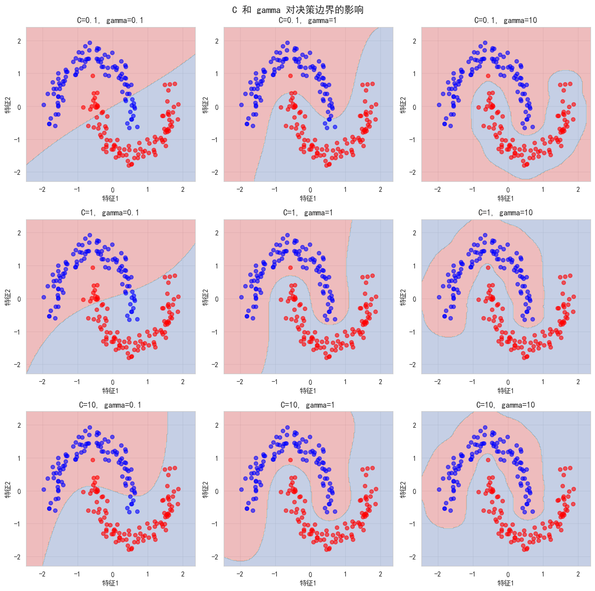print("- 右下角(C大, gamma大):决策边界复杂,可能过拟合")