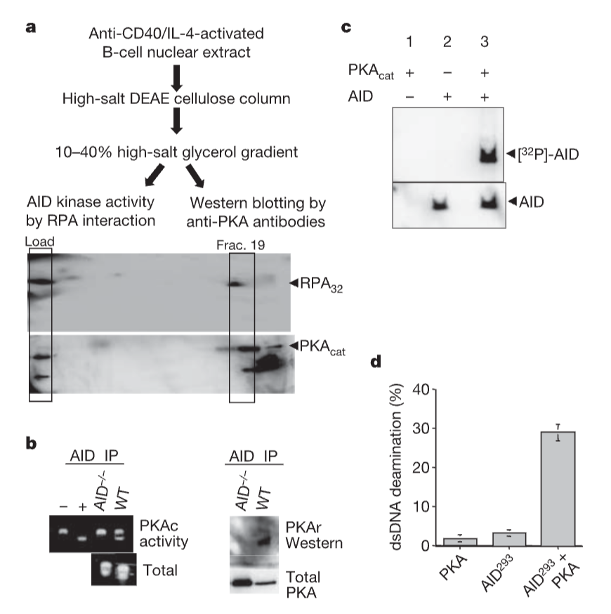 本文从题目《The AID antibody diversification enzyme is regulated by protein kinase A phosphorylation》实验技术角度出发,总结AID Ser38磷酸化位点的鉴定与功能验证流程,包括体外PKA激酶实验、RPA结合分析、dsDNA脱氨活性检测及回补突变体的CSR功能评估,适合从事免疫学与蛋白质修饰研究的科研人员参考。