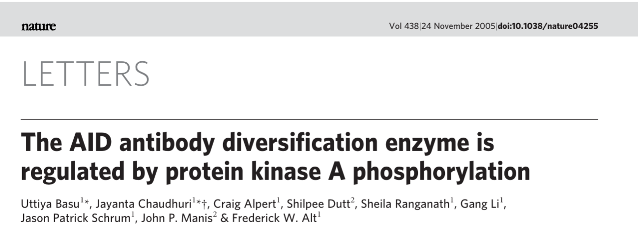1\]Uttiya B ,Jayanta C ,Craig A , et al.The AID antibody diversification enzyme is regulated by protein kinase A phosphorylation.\[J\].Nature,2005,438(7067):508-11.