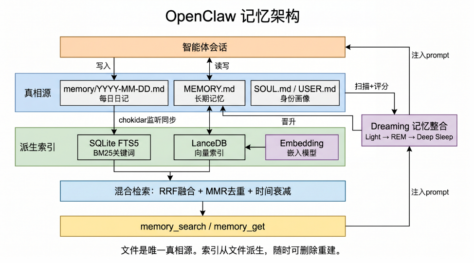 两个索引:SQLite FTS5 做 BM25 关键词检索,LanceDB 做向量检索。在索引之上做混合检索,用 RRF 融合、MMR 去重、再加时间衰减。对外暴露两个接口:memory_search 和 memory_get。