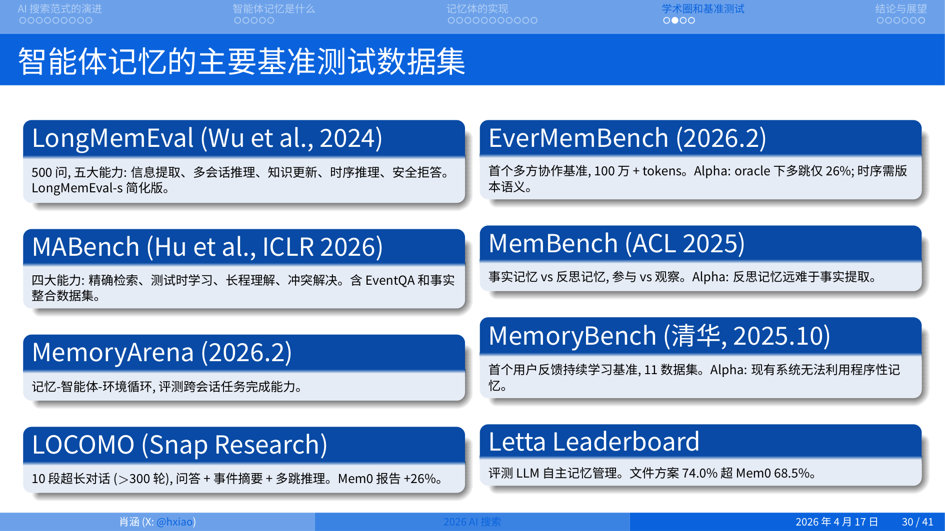 目前主要的数据集有 LongMemEval(500 问,测五大能力:信息提取、多会话推理、知识更新、时序推理、安全拒答)、MABench(ICLR 2026,测精确检索、测试时学习、长程理解、冲突解决)、MemoryArena、LOCOMO、EverMemBench(首个多方协作基准,100 万 + tokens)、清华的 MemoryBench(首个用户反馈持续学习基准)。