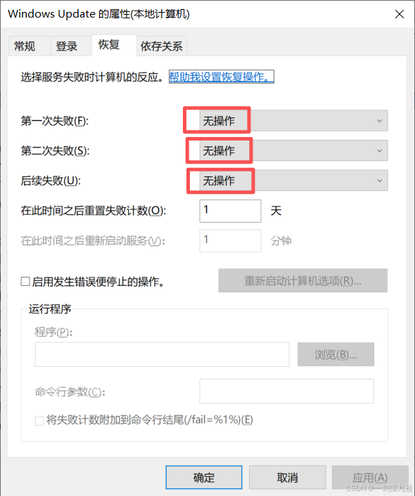 3、防止自动恢复:在"恢复"选项卡中,将失败后的操作全部设为"无操作",避免服务自动重启 。